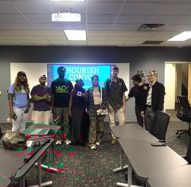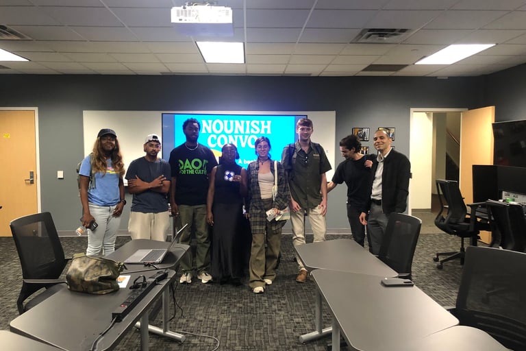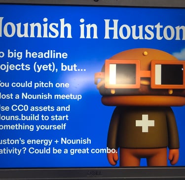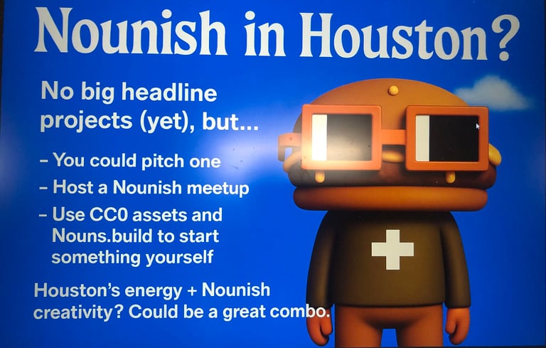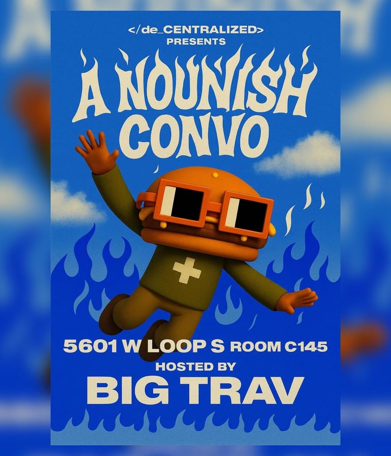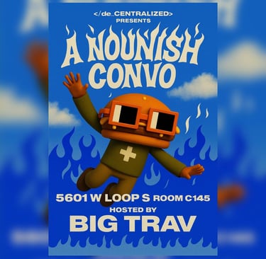 In June 2025 </de_CENTRALIZED> featured presentation by Travis Rice on Nouns DAO at one of our new HCC campus locations! Travis covered how Nouns is a community-owned brand that makes a positive impact by funding ideas of all sizes and domains and fostering collaboration. It serves collectors, technologists as well as non-profits and brands and everyone can get involved, whether you own Noun or want to contribute your talent. Nouns are an experimental attempt to improve the formation of on-chain avatar communities. Nouns attempt to bootstrap identity, community, governance, and a treasury that can be used by the community. One Noun is trustlessly auctioned every 24 hrs.